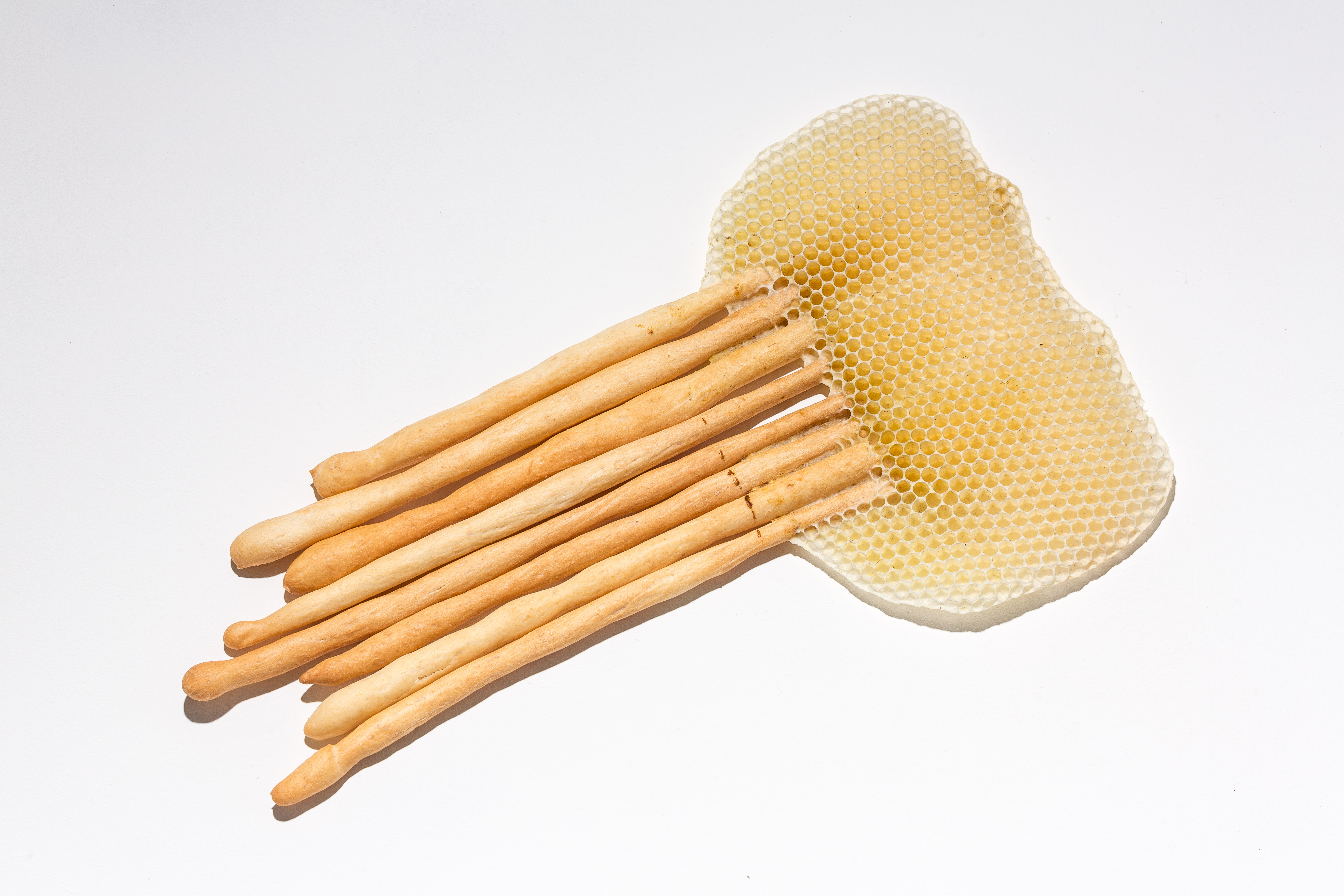 Pane e Miele is an exhibition of twelve sculptural works of bread and honeycomb; the latter made and attached by Apis mellifera (the European honeybee). With these twelve sculptures the artists have gently, but deliberately, tested the adaptability of bees as animal architects. The objects highlight the intelligence of bees as architects; as well as the connection between bees and the food we eat.